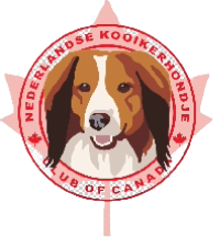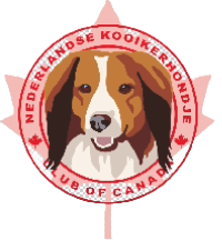 NKCC club logo containing the head of a red and white Kooiker dog, surrounded by red text that reads "Nederlandse Koolkerkhondje" and "Club of Canada," and features red maple leaf symbols.